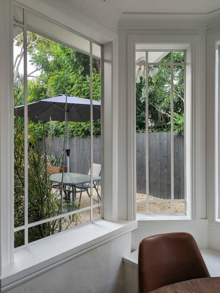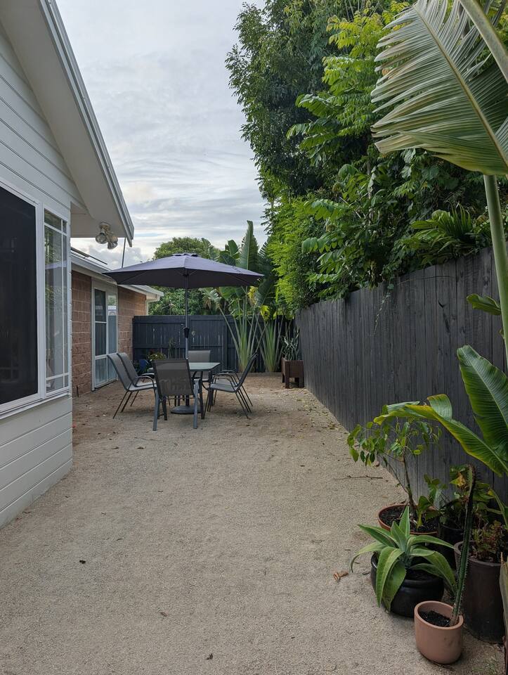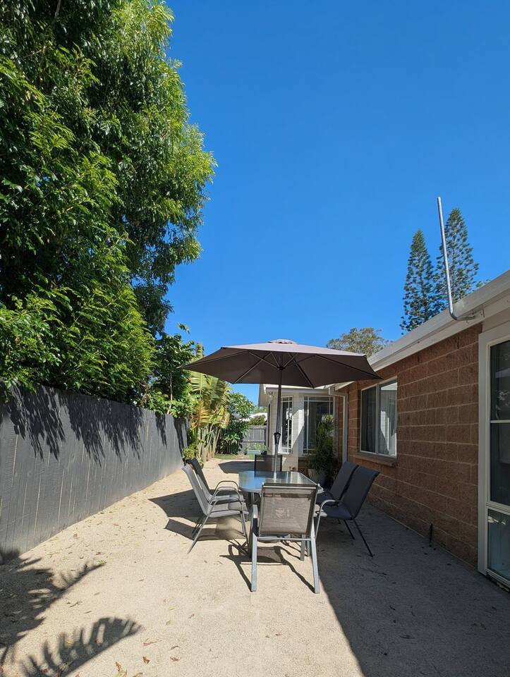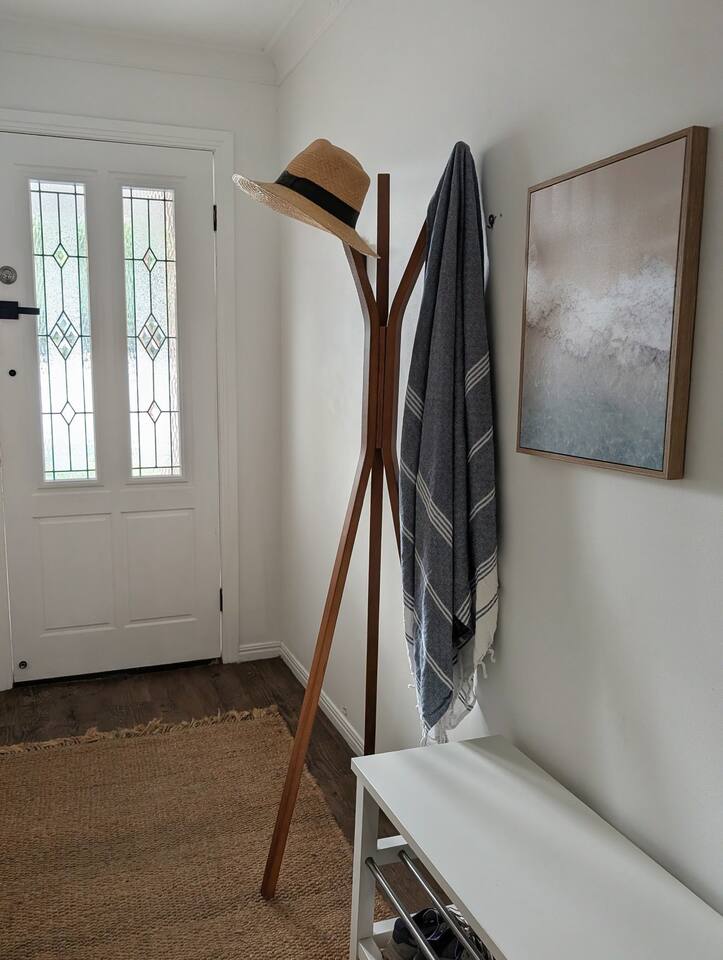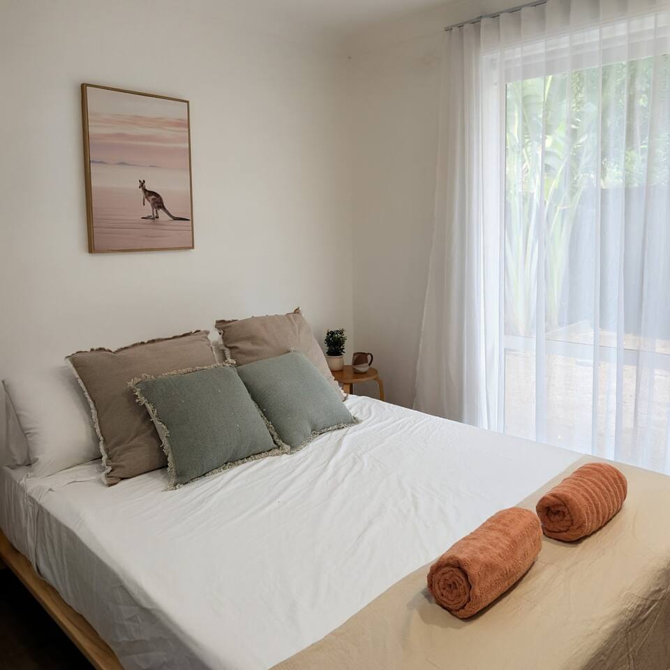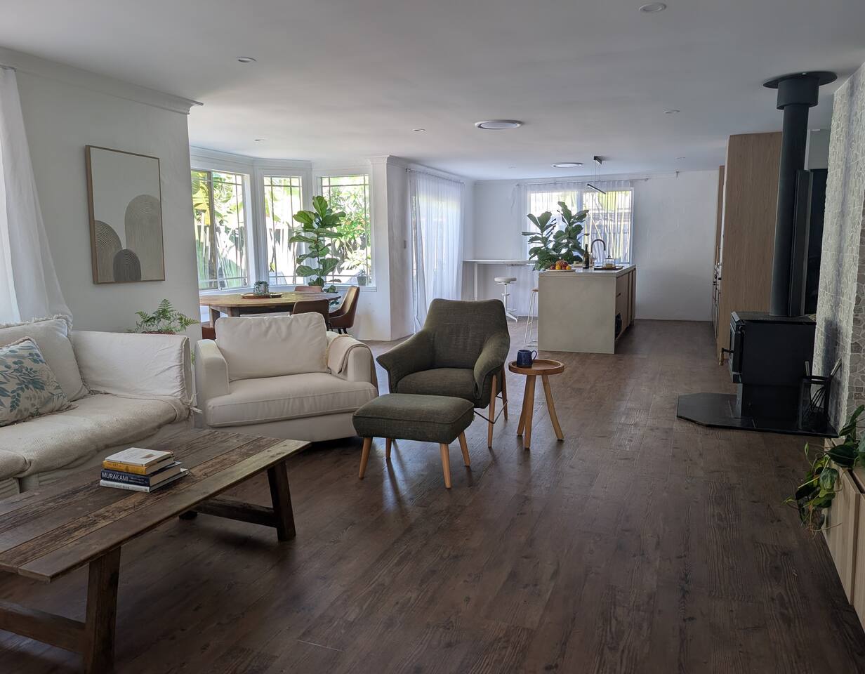 Blending modern comfort with relaxed style, this sun-drenched single-story home is designed for connection and relaxation. The open-plan layout creates a seamless flow from the living areas to your private garden oasis. * **Living & Dining:** Unwind in the spacious living area on the large, deep sectional sofa for a movie night on the big-screen TV (with Netflix, Prime Video, and Foxtel). Enjoy meals together at the rustic dining table, the kitchen island bar, or the outdoor dining setting. * **Kitchen & Bath:** Create delicious meals in the newly renovated, fully equipped kitchen, complete with a Breville espresso machine and bean grinder, dishwasher, a stove with an air fryer, and a wine fridge. The full-size bathroom offers both a relaxing bathtub and a separate walk-in shower. * **Sleeping Arrangements (Up to 6 Guests):** * **Bedroom 1:** A serene space with a King bed, wardrobe, dresser, blackout blinds, and its own ceiling fan and individually controlled ducted air conditioning. * **Bedroom 2:** A beautiful room with a Queen bed, open shelves, blackout blinds, and its own ceiling fan and individually controlled ducted air conditioning. * **Flexible Sleeping:** A double pull-out sofa, an extra-deep sofa, and two comfortable fold-out mattresses (one king single, one single) are available upon request. * **Private Garden Oasis:** Step outside into the large, fully fenced garden, bordered by the leafy trees of the quiet park just beyond the fence—offering extra greenery and a peaceful outlook. Lounge in the hammock, fire up the BBQ, or rinse off after a day at the beach in the refreshing outdoor shower. **Comfort & Convenience:** * Super-fast Starlink internet and an adjustable standing desk. * Ducted air-conditioning with heating function and room-by-room temperature control. * Two complimentary bikes with locks and helmets. * Laundry room with a washer and dryer. * Beach towels, a beach umbrella, and a clothes steamer. * Bluetooth sound system, books, and board games. * Pet-friendly: We welcome well-behaved pets! Please let us know in advance if you’re bringing one. (Limit: 2. No pets on furniture, please.)